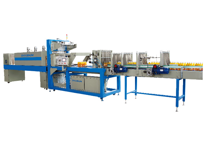 進料輸送機構連接生產線,分包機構按包裝規(guī)格分組,撥桿機構配合輸送,在運行中自動整形,運行中自動套膜封切,自動完成熱收縮及冷卻工藝。